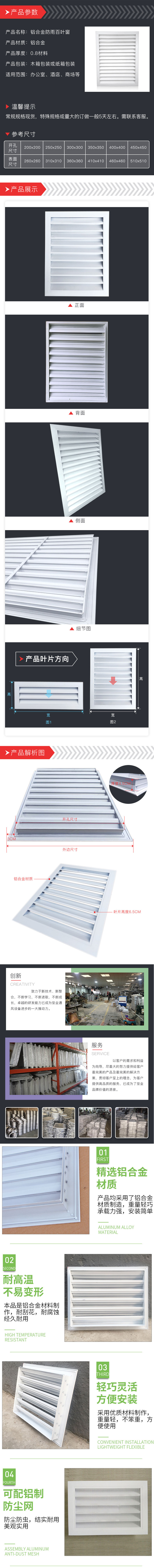 防雨百葉主要應(yīng)用于通風(fēng)工程,作用是防雨通風(fēng)的。是由防雨葉片和帶滴水框的側(cè)框架組成的,通風(fēng)工程用。