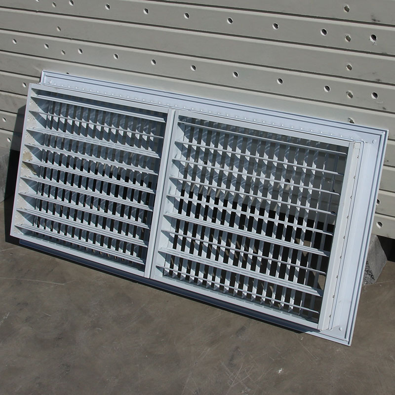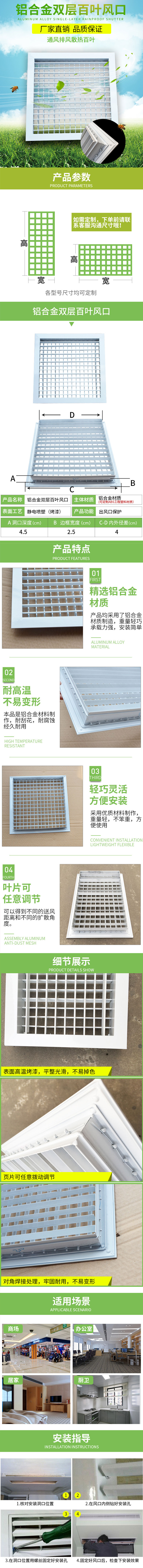 雙層百葉風口,廣泛應用于空調系統中作送風口,根據使用要求,風口后面可配制鋁制風量調節閥(人字閘),雙層百葉風口具有兩層相互垂直頁片調節水平和垂直頁片的角度。