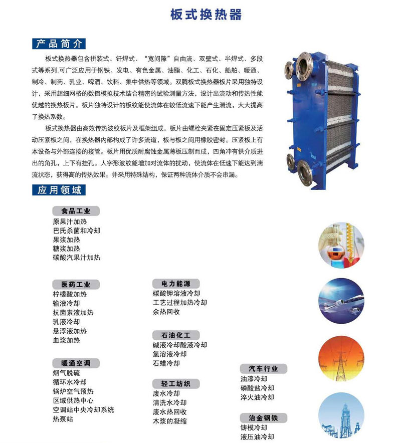 板式換熱器包含拼裝式、軒焊式、“寬間腺”自由流、雙壁式、半焊式、多段式等系列,可廣泛應用于鋼鐵、發電、有色金屬、油脂、化工、石化、船舶、暖通制冷、制藥、乳業、啤酒、飲料、集中供熱等領域。