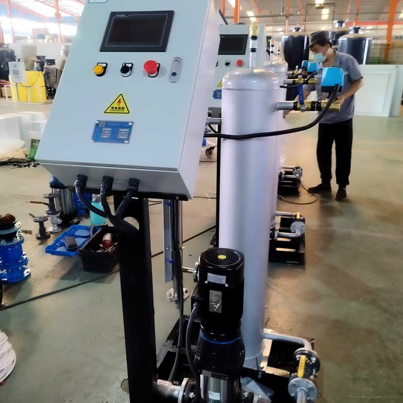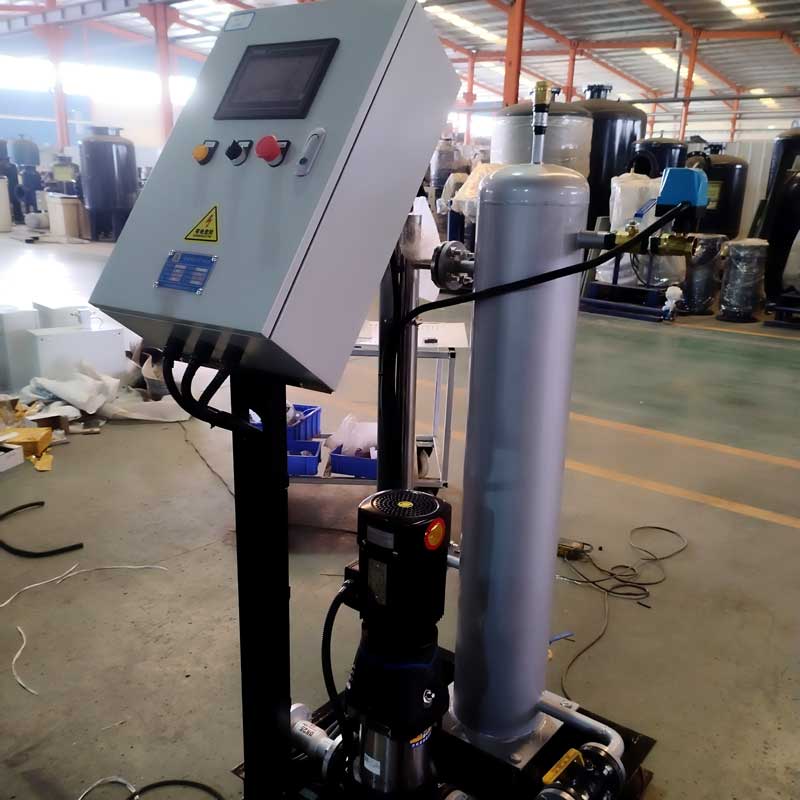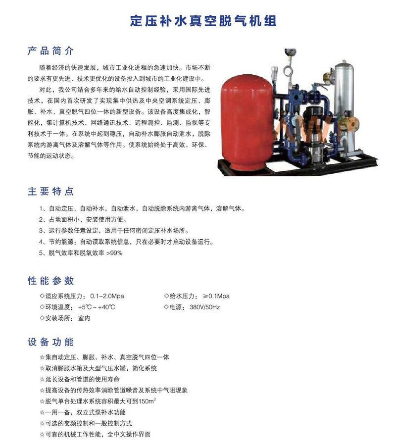 定壓補(bǔ)水真空脫氣機(jī)組是采用國(guó)際先進(jìn)技術(shù)研發(fā)的實(shí)現(xiàn)集中供熱及中央空調(diào)系統(tǒng)定壓、膨脹、補(bǔ)水、真空脫氣四位一體的新型設(shè)備。該設(shè)備在系統(tǒng)中起到穩(wěn)壓、自動(dòng)補(bǔ)水、膨脹自動(dòng)泄水、脫除系統(tǒng)內(nèi)游離氣體及溶解氣體等作用,使系統(tǒng)始終處于高效、環(huán)保、節(jié)能的運(yùn)動(dòng)狀態(tài)。