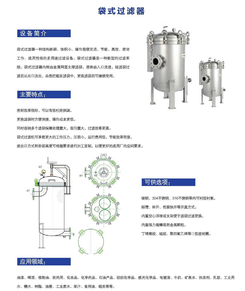 袋式過濾器是一種結構新穎、體積小、操作靈活簡便、節(jié)能、高效、密閉工作、適用性強的多用途過濾設備。