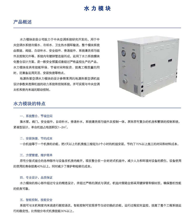 水力模塊用于中央空調(diào)水系統(tǒng)冷媒水、冷卻水、衛(wèi)生熱水循環(huán)輸送,整個模塊系統(tǒng)由泵組、閥組、自動補水、安全組件、旁通組件、系統(tǒng)清洗排污組件及控制元件等組成,系統(tǒng)內(nèi)由鍍鋅管連接而成,運用了水力系統(tǒng)模塊化整合,是一款安全預(yù)置成套經(jīng)過嚴(yán)格監(jiān)控生產(chǎn)的產(chǎn)品。水力模塊具有技能環(huán)保、節(jié)省時間和投資、提高工程質(zhì)量,同時還兼?zhèn)溥\用靈活、安裝快捷等特點。地源熱泵空調(diào)水力模塊參照常用的地源熱泵空調(diào)機組參數(shù)來選擇機組的動力系統(tǒng)和控制系統(tǒng),并可實現(xiàn)與中央空調(diào)主機和室內(nèi)末端的聯(lián)動控制。