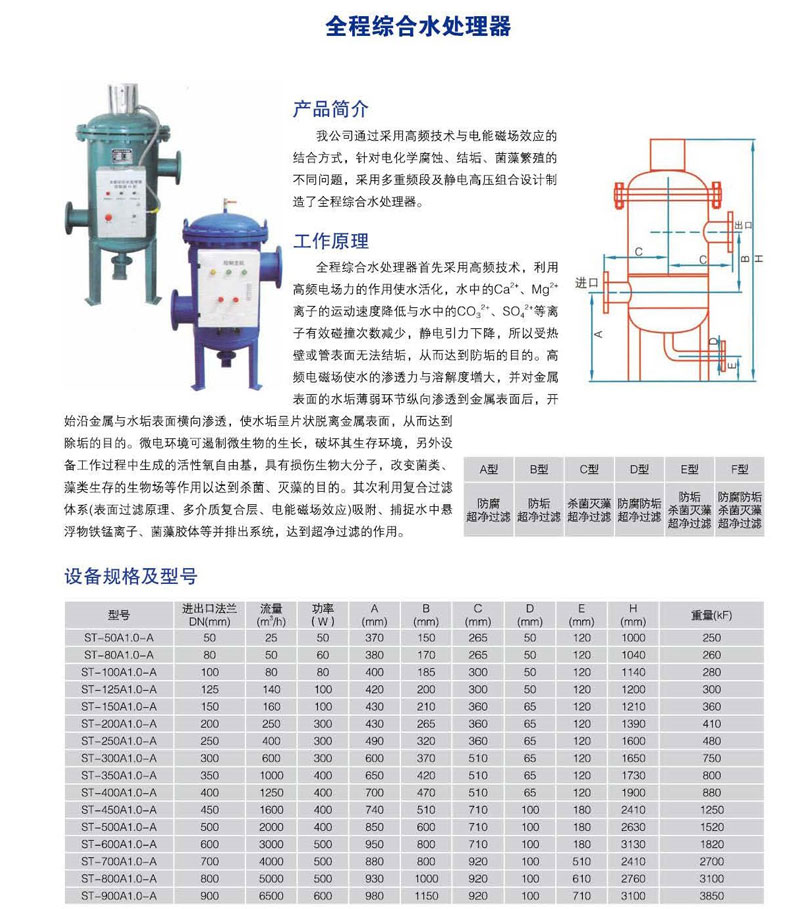 全程綜合水處理器是采用高頻技術與電能磁場效應的結合方式,主要針對電化學腐蝕、結垢、菌藻繁殖的不同問題,并采用多重頻段及靜電高壓組合的方式研制而成。